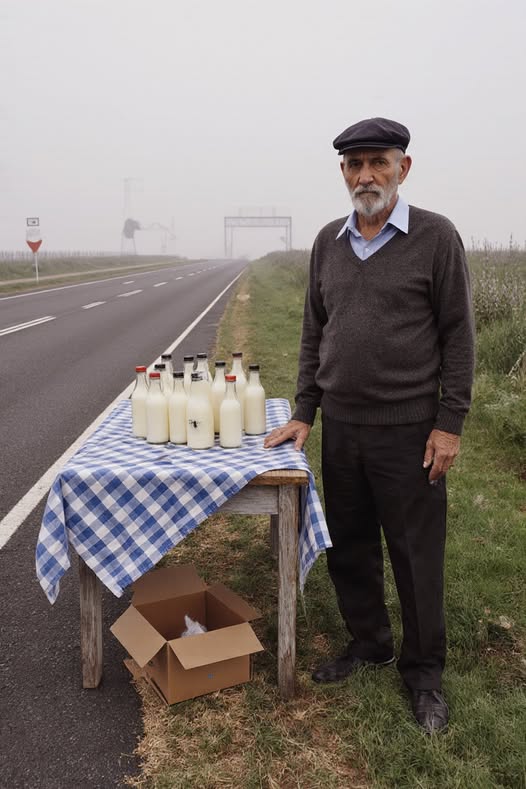 Он был маленьким, едва ровным, накрытым выцветшей синей скатертью, которая развевалась на ветру, словно у нее были свои собственные истории. На нем стоял ровный ряд стеклянных бутылок с молоком — без этикеток, без ценников, без вывески. И мужчина, неподвижно стоявший за ними.